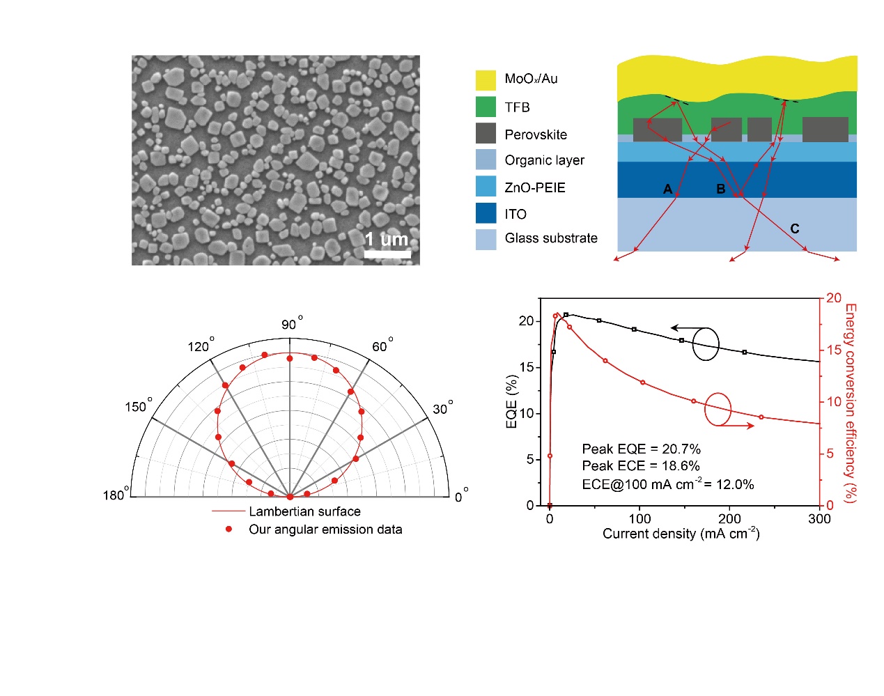 针对这一世界性的重大科学难题,黄维院士、王建浦教授所带领的团队,通过一种简单的低温溶液法,实现了由一层非连续、不规则分布的钙钛矿晶粒和嵌入在钙钛矿晶粒之间的低折射率有机绝缘层组成的发光层,进而大幅度地提高了LED的光提取效率。据IAM团队学术带头人、该研究主要负责人、先进材料研究院常务副经理王建浦教授介绍,使用该方法制备的LED器件外量子效率达到20.7%,在100 mA cm-2的电流密度下能量转化效率达到12%。此外,通过与浙江大学田鹤教授、戴道锌教授团队之间的合作,他们发现该方法形成的非周期性结构可以将LED光提取效率提高10个百分点。