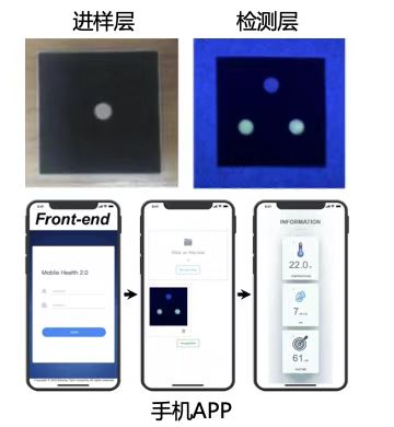 进样层滴加待测液,经过设计的微通道分别流入检测层,通过与预先固定的荧光探针结合,荧光信号在右上图中显示,手机App将拍照图片导入后,经计算显示出最终待测液浓度。吴琼供图