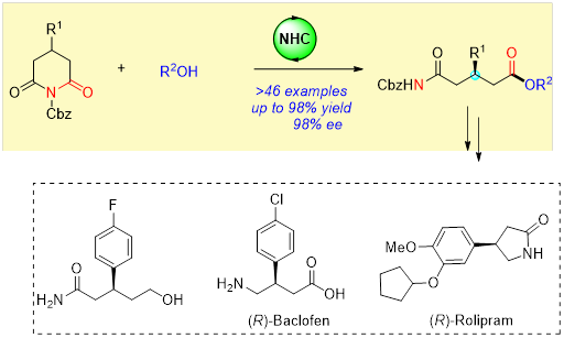 手性是自然界中一种最基本的属性。例如,与生命活动密切相关的核酸和蛋白质等都具有手性。虽然手性化合物中对映体的分子组成相同,但是生理活性却往往不尽相同。反应停事件就是一个典型事例。因此,精准构筑单一镜像手性化合物具有重大研究意义。不对称催化符合绿色化学和可持续发展的要求,是精准构筑单一镜像手性化合物的最有效方法,近年来一直是有机化学、药物化学和材料科学等领域的研究热点。2001年和2021年的诺贝尔化学奖分别授予了从事过渡金属催化和有机小分子催化的科学家,彰显了这一研究领域的重要性。氮杂环卡宾作为最重要的有机小分子催化剂之一,被广泛应用于有机合成中,尤其是不对称催化领域。近年来,虽然氮杂环卡宾的催化取得了长足的发展,但催化模式涉及的底物仍主要集中在醛、烯醛和酯。继续丰富和发展氮杂环卡宾催化新模式新策略具有重要研究意义。