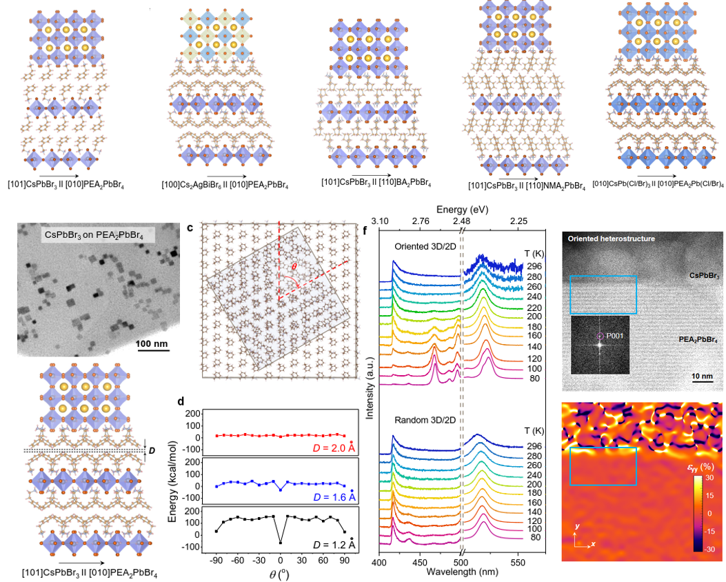 针对该问题,威廉希尔williamhill官方网站的黄维院士、黄晓教授、王琳教授团队开发了一种室温下通过定向自组装制备3D/2D钙钛矿外延异质结的普适方法。他们以CsPbBr3/PEA2PbBr4为例,展示了如何通过改变两种钙钛矿表面配体的种类影响晶体间的相互作用、相对转角以及界面分子的有序性,进而实现了CsPbBr3在PEA2PbBr4晶体表面的取向外延组装。相较于传统方法形成的随机组装界面,该外延异质结界面有着更强的界面耦合作用,增强了钙钛矿晶体间的能量与电荷转移。此外,该自发外延组装过程诱导了2D钙钛矿的表面晶格畸变与带隙变化,使材料在低温下表现出超宽波长范围的多重激子态发光。