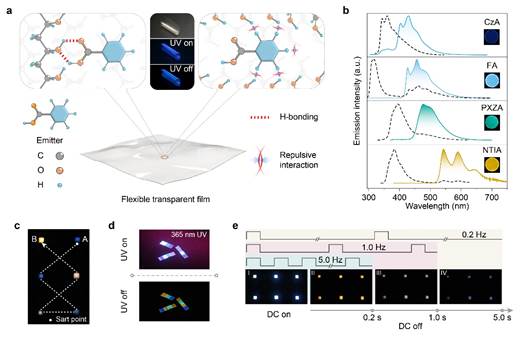 近日,威廉希尔williamhill官方网站黄维院士、史慧芳教授和安众福教授带领的研究团队在有机长余辉发光领域取得重大突破。他们打破传统的利用分子间吸引力稳定磷光分子的常规策略,利用分子间排斥力稳定磷光分子,获得一系列具有超长室温磷光的柔性聚合物薄膜,实现了高效的单分子态长余辉发光,同时展现了该柔性薄膜材料在防伪、路径示踪、频率的可视化检测等领域的应用潜力。相关成果以题为“Ultralong organic phosphorescence from isolated molecules with repulsive interactions for multifunctional applications”发表在Nature Communications(《自然•通讯》)上。