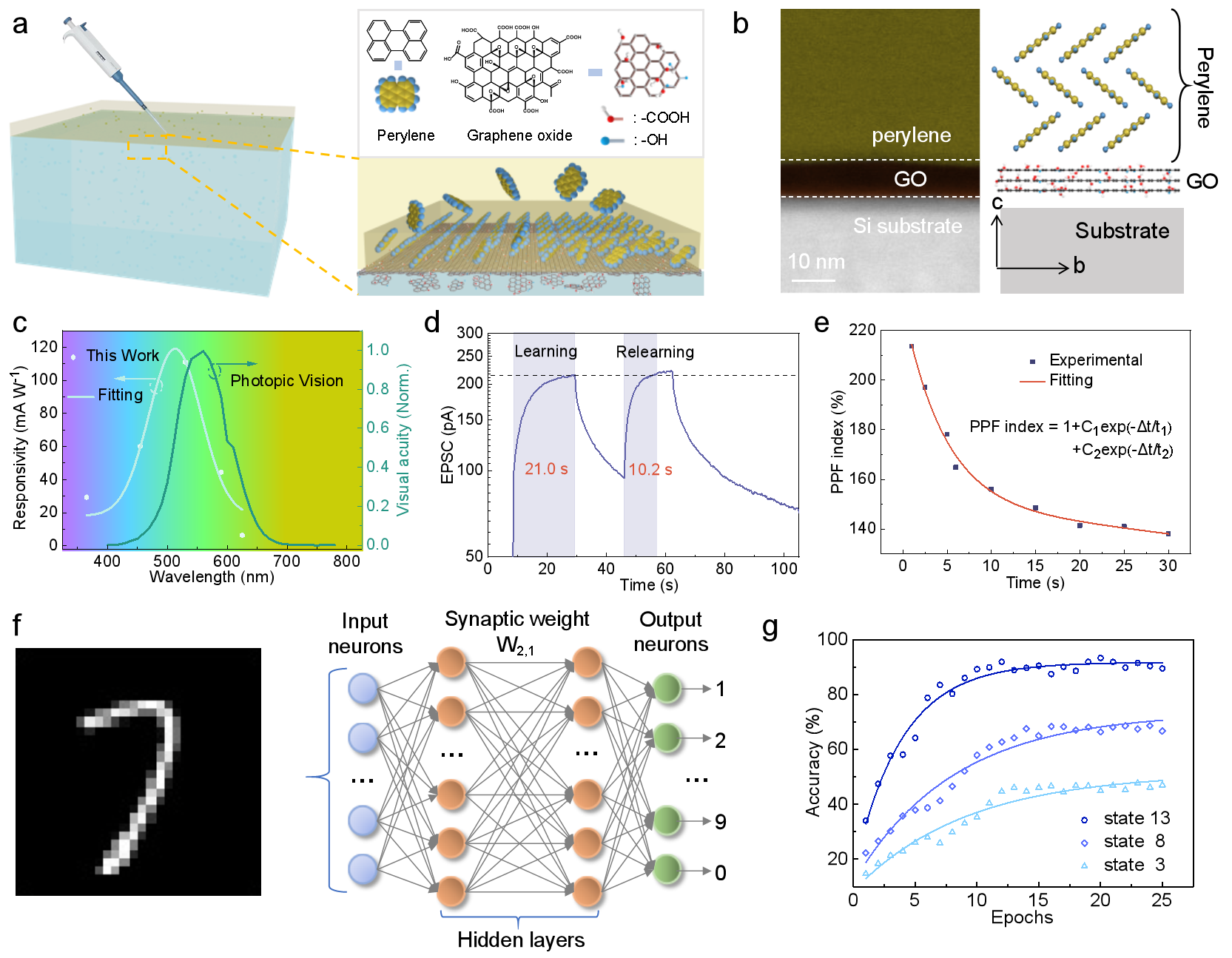 相关成果以“Co-assembled perylene/graphene oxide photosensitive heterobilayer for efficient neuromorphics”为题发表在世界顶级期刊Nature Communications(《自然•通讯》)上。威廉希尔2019级硕士生张河山、2021级博士生董雪梅为论文共同第一作者。该工作得到了国家重点研发计划、国家自然科学基金等项目的支持。